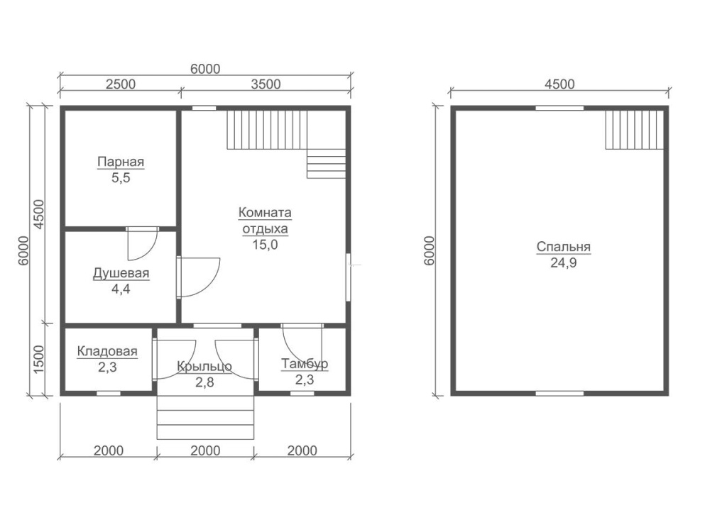 Сруб с мансардой: 1-ый этаж- 2,3 м. (17 венцов) 2-ой этаж (мансарда)- 2,3 м. Сруб в полтора и два этажа: 1-ый этаж 2,3 м. (17 венцов) 2-ой этаж 2,3 м. каркасные аттиковые стены (боковые) высотой 1,5 м. в полутораэтажной бане. 2,3 м. (поднят брусом на 17 венцов) в двухэтажной бане. |