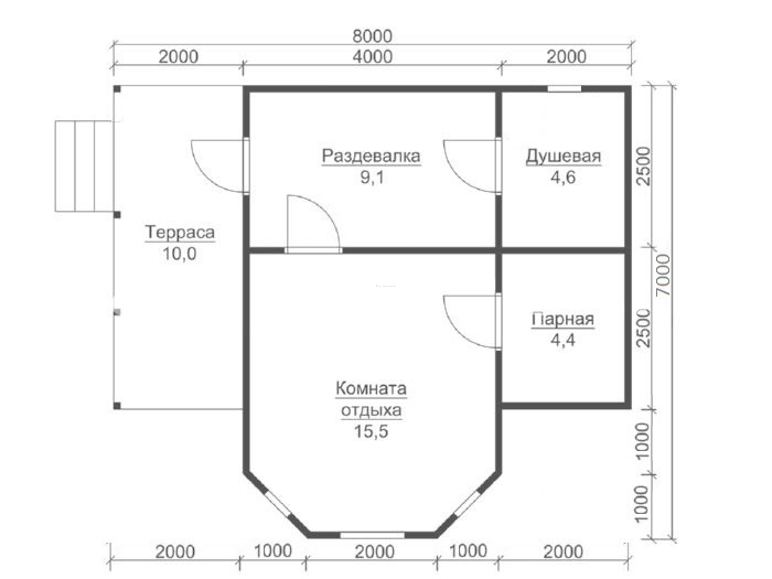 | Двери | Входная- металлическая, утеплённая (Россия). Межкомнатные- филёнчатые. В парную- клиновая (банная). | Отсутствуют. |
